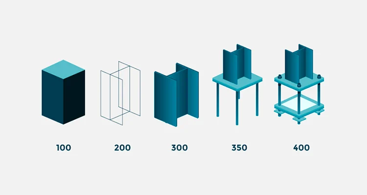 - LOD200-koncepcyjny– Obiekt przedstawiany jest za pomocą uproszczonych symboli zastępczych z minimalną ilością detali, które umożliwiają identyfikację typu obiektu. Model na poziomie LOD200 posiada przybliżone wymiary, geometrię, lokalizację i orientację.